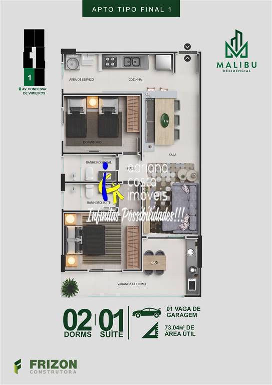 Apartamento final 1 (3 unidades disponíveis - consulte valores) - 73,04 m² de área útil com 2 dormitórios (1 suíte), 1 banheiro social, sala 2 ambientes, varanda gourmet, 1 vaga de garagem. Apartamento entregue todo com piso porcelanato. Lazer: piscina e salão de festas. Entrega dezembro de 2025. Localizado a 100 metros da praia. Marque já sua visita!!!
