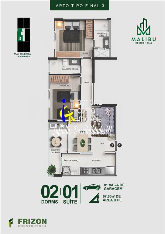 Apartamento final 3 (2 unidades disponíveis - consulte valores) - 67,60 m² de área útil com 2 dormitórios (1 suíte), 1 banheiro social, sala 2 ambientes, varanda gourmet, 1 vaga de garagem. Apartamento entregue todo com piso porcelanato. Lazer: piscina e salão de festas. Entrega dezembro de 2025. Localizado a 100 metros da praia. Marque já sua visita!!!
