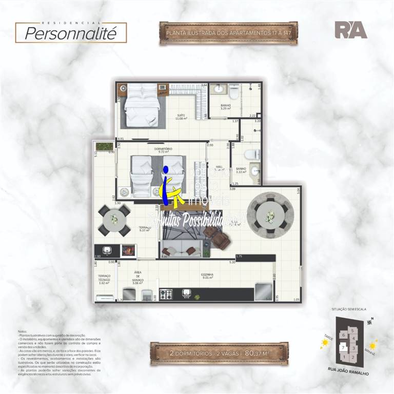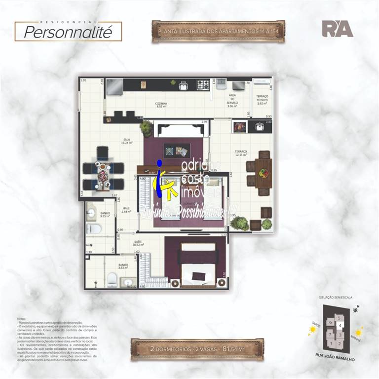 Apartamento com 81,54 m² de área útil com 2 dormitórios (1 suíte), 1 banheiro social, sala 2 ambientes, varanda gourmet,cozinha americana, área de serviço, 1 vaga de garagem. Lazer: Espaço gourmet, Cinema, Salão de festas, Salão de jogos, Fitness, Sauna, Sala de massagem, SPA center, Beauty center, Brinquedoteca, Lounge coberto.